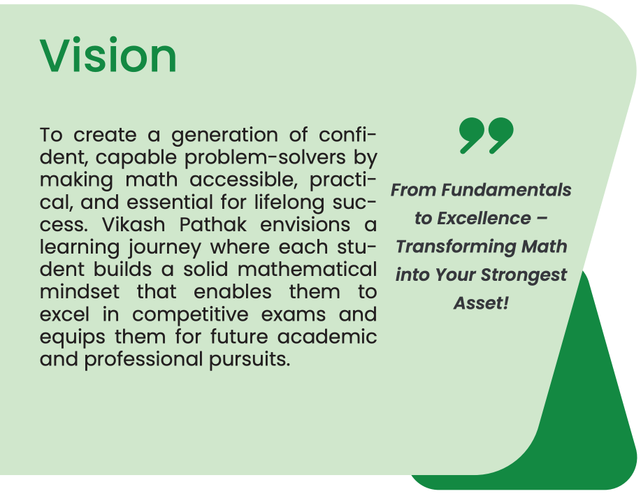 Our mission is to deliver results-driven, concept-focused math education that prepares students for SSC and other competitive exams with clarity and confidence. We are committed to building a strong foundation, empowering students to tackle any challenge with proven techniques and unwavering self-belief.